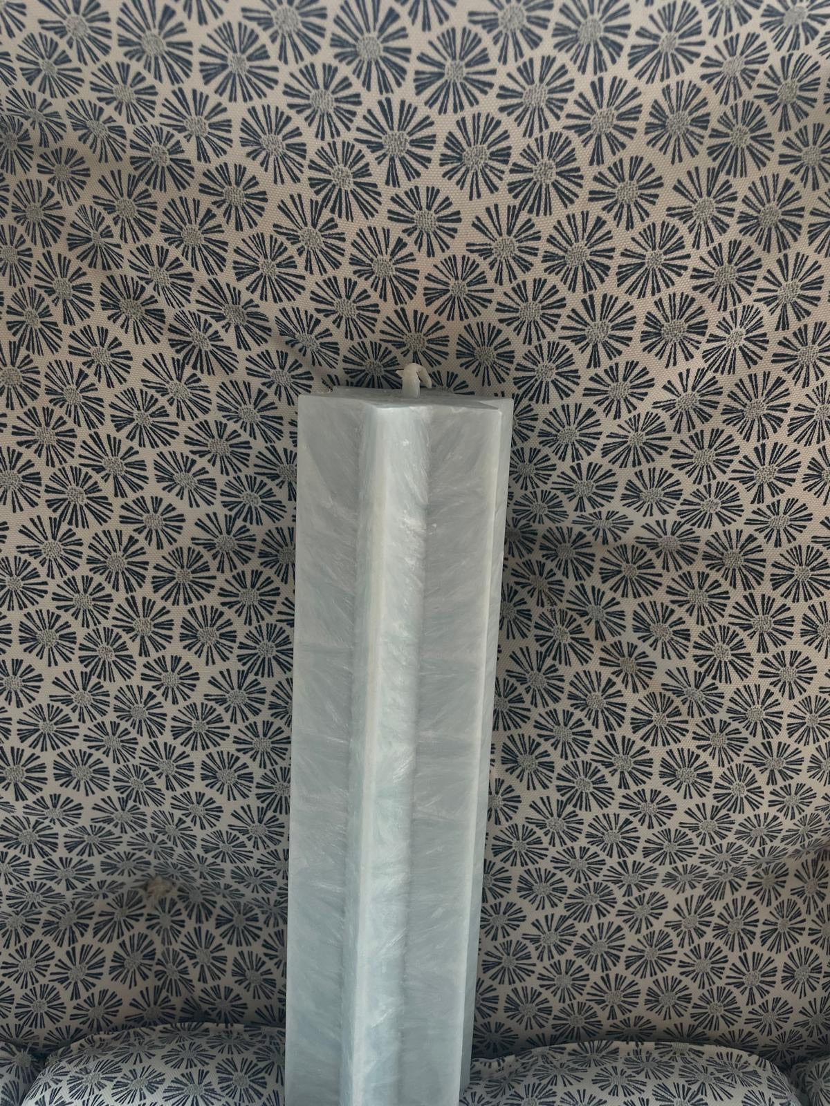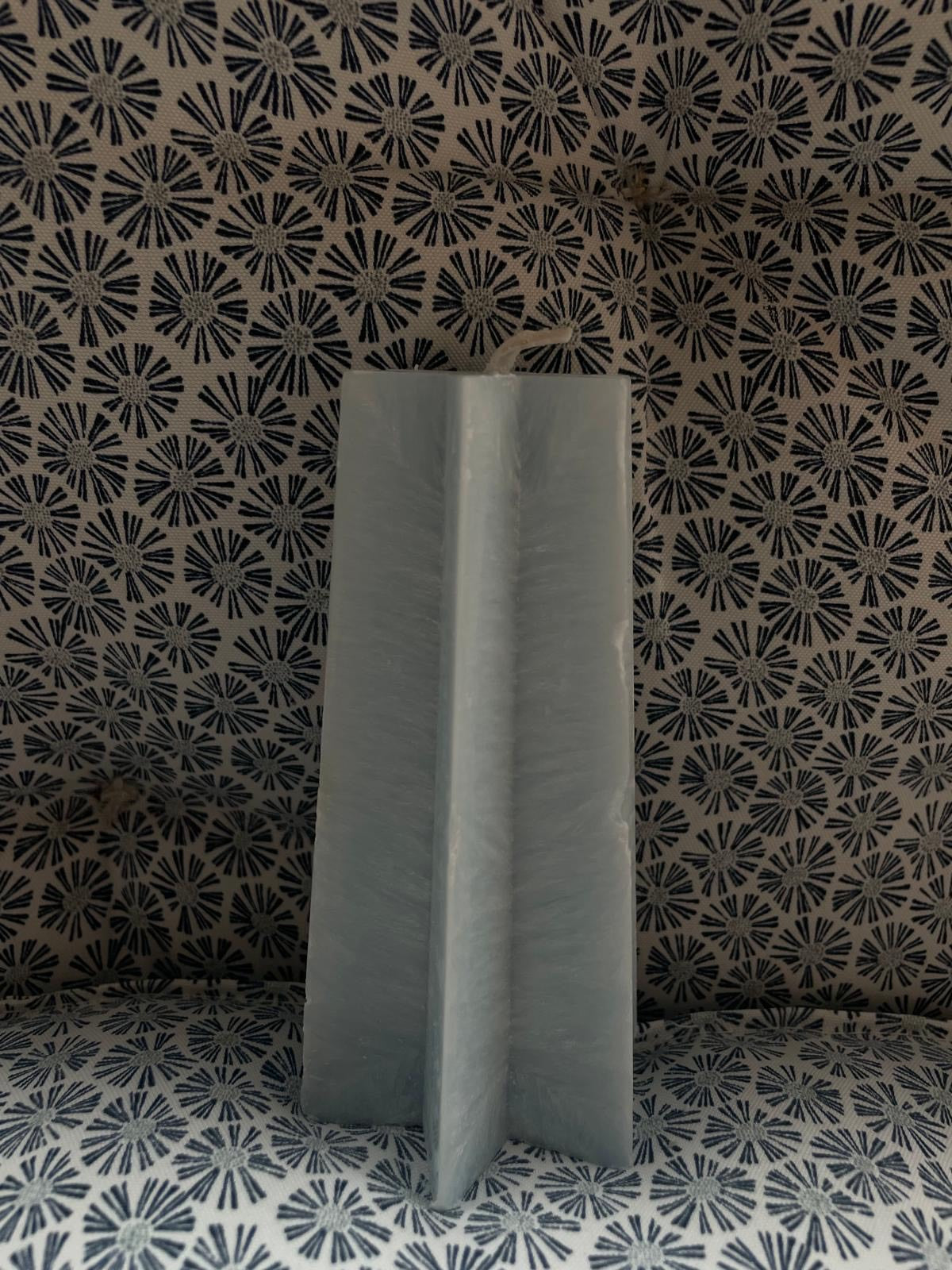 Ručně odlévaná svíčka v jemně modré barvě s geometrickým designem.